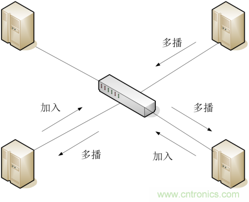 當一臺裝置想加入某個多播組時,首先發(fā)出GMRP加入報文,交換機將接到的GMRP加入報文的端口加入該多播組,并在VLAN中廣播該GMRP加入報文,VLAN中的多播源就知道了多播成員的存在。當組播源向組播組發(fā)送組播報文時,交換機只把該報文從先前加入到該組播組的端口轉(zhuǎn)發(fā)出去,從而實現(xiàn)VLAN內(nèi)的二次組播。如圖 1-2所示。