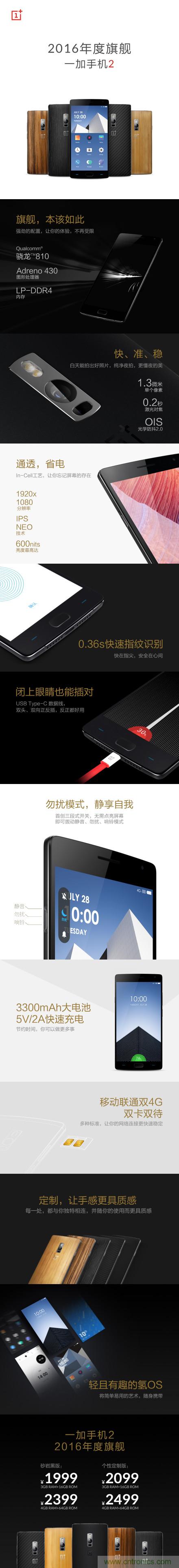 整體硬件上,一加二代擁有5.5寸1080P分辨率屏幕;采用新版驍龍810處理器+3GB RAM+16GB ROM基本硬件組合(高配版采用5.5寸2K屏幕+驍龍810+4GB RAM+32GB ROM);配備后置OIS光學防抖+激光對焦1300萬像素主鏡頭和500萬像素前置鏡頭;新加入前置指紋識別,支持最快0.36s解鎖;選用雙面可插拔 USB Type-C接口;內置3300毫安時鋰電池,支持移動聯通雙卡雙4G。