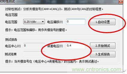 注意:由于GMW3122規(guī)定CANH+CANL的電壓要在4.2V~5.8V,而正常為5V。所以在采用對稱性測試時,其中使用的是(CANH+CANL)/2進(jìn)行判別。 所以標(biāo)準(zhǔn)范圍為2.1V~2.9V,正常為2.5V。因此圖7中誤差電壓需要填入0.4。