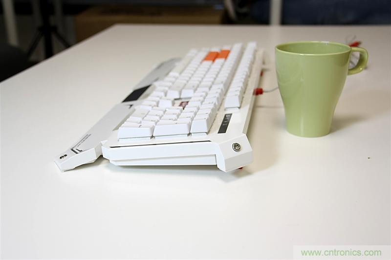 雖然B740鍵盤是傾斜式設計,但為了滿足更多樣化的玩家,鍵盤背面上部還是加有增高腳架,并且在腳架底部包有紅色膠套,有防滑、降低震動的效果。