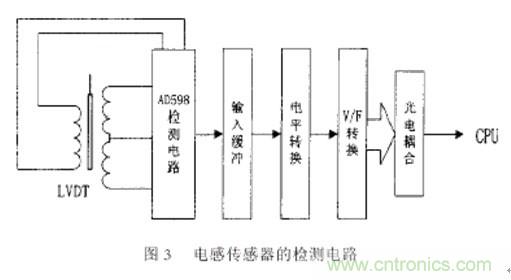 如圖3所示,由于采用了最新的大規(guī)模集成電路,電感傳感器的檢測電路比較簡單,且集成電路采用了新的調(diào)制解調(diào)方法和算法,減少了以前的檢測外差式調(diào)頻檢測電路方法由于傳感器的激勵信號的相角、頻率以及幅值漂移對檢測結(jié)果的影響,大大進(jìn)步了檢測精度和穩(wěn)定性。