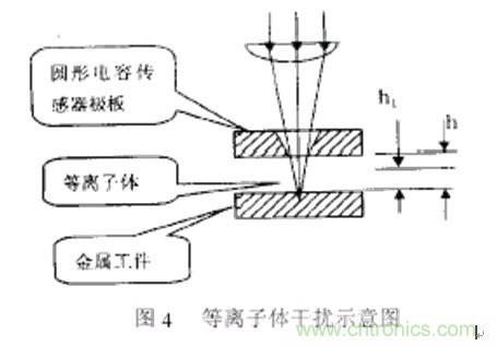 在工件尚未被切穿的瞬間,激光和金屬相互作用,在噴嘴和加工對象之間產(chǎn)生云霧狀等離子體,改變電容極板之間的介質(zhì),從而對電容傳感器產(chǎn)生干擾。在正常切割過 程中,輔助氣體將等離子體從切縫中吹散,對電容傳感器產(chǎn)生影響較小。但假如加工速度太快和剛開始切割時,由于工件未被完全切穿,激光照射點四周會產(chǎn)生等離 子體云,對電容傳感器產(chǎn)生干擾,嚴(yán)重時甚至使傳感器無法正常工作,嚴(yán)重影響加工質(zhì)量。圖4為等離子體干擾示意圖。