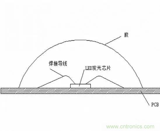 COB封裝,是英語Chip On Board的縮寫,直譯就是芯片放在板上。 是一種區別于DIP和SMD封裝技術的新型封裝方式。如圖所示
