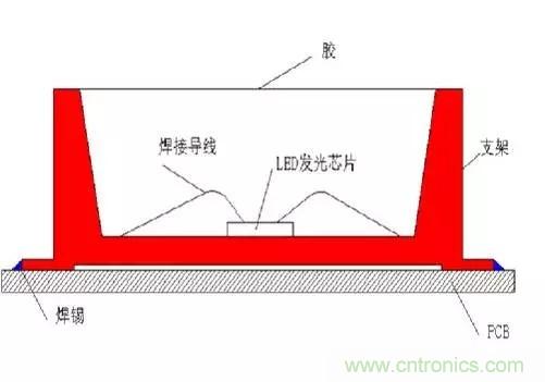 眾所周知,回流焊爐內一般會有240°的高溫。如果環氧樹脂膠TG點過低,或封裝過程有潮氣吸入,高溫會導致膠體非線性急劇膨脹,導致LED芯片焊線拉斷破壞失效。另外高溫會通過支架管腳將熱量快速傳導到芯片,造成芯片體龜裂碎化失效的可能性增加。而這種問題是最可怕的,一般在工廠老化測試時也不會出現問題,經過運輸到客戶端再使用一段時間問題就會逐步暴露出來。