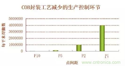 如果生產1平米的P10,COB封裝工藝就要省去4萬個控制點。如果將點密度縮小一倍,也就是點密度達到P5級別,COB封裝工藝每平米就要省去16萬個焊點。如果將點密度進一步縮小到P2.0級別,COB封裝工藝每平米就要省去100萬個焊點。如果點密度達到P1.0級別,COB封裝工藝將會省掉400萬個焊點。相反SMD封裝如何保證這幾百萬個焊點不出現假焊、連焊、虛焊,是一項令人十分頭疼的問題。