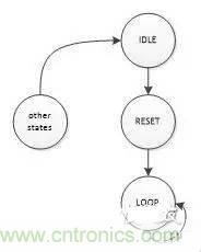 CPLD其內(nèi)部沒(méi)有RAM,這樣就不能依靠RAM的初始化數(shù)據(jù)來(lái)產(chǎn)生可靠的復(fù)位;從原理上說(shuō),器件上電后,其寄存器的狀態(tài)是不確定的,因此我們是沒(méi)法得到一個(gè)確定的初始狀態(tài)去產(chǎn)生一個(gè)可靠的內(nèi)部復(fù)位信號(hào),不過(guò)我們還是可以產(chǎn)生一個(gè)有一定失敗概率但概率可控的復(fù)位信號(hào),其基本原理是:設(shè)計(jì)一個(gè)n位的狀態(tài)機(jī),見(jiàn)下圖,其中一種狀態(tài)表示復(fù)位結(jié)束(記為L(zhǎng)OOP),只要進(jìn)入該狀態(tài)就會(huì)一直保持在LOOP狀態(tài)上,至于其他狀態(tài)都會(huì)跳入復(fù)位狀態(tài)(記為RESET),RESET狀態(tài)是暫態(tài),一個(gè)時(shí)鐘周期就離開(kāi)進(jìn)入LOOP狀態(tài);由于狀態(tài)LOOP出現(xiàn)的概率僅為:1/2n,我們控制n的長(zhǎng)度,就可以將復(fù)位失敗概率控制在設(shè)定的要求內(nèi)。