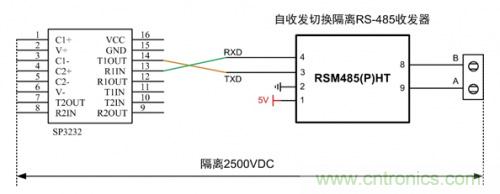 圖 5 簡(jiǎn)易隔離RS232轉(zhuǎn)RS485方案二