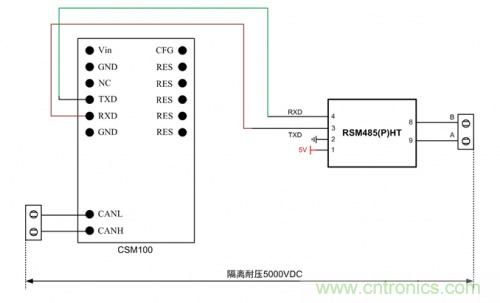 RS485和CAN雖然物理層都是差分傳輸,但因CAN多了更多的底層協(xié)議,兩者不能通過(guò)簡(jiǎn)單的方式直接轉(zhuǎn)換。此時(shí),使用如圖6所示的CSM100+RSM485模塊方式,利用CSM100能將CAN轉(zhuǎn)成UART數(shù)據(jù),再用RSM485PHT將UART轉(zhuǎn)成RS485電平,實(shí)現(xiàn)RS485轉(zhuǎn)CAN的功能。