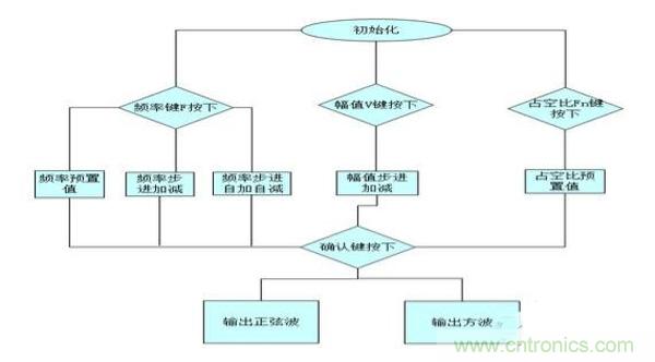 單片機控制AD9851產生頻率和相位都可控的正弦波,頻率量由鍵盤設定,步進量為5Hz,AD9851頻率分辨率為0.006985Hz,完全能夠滿足要求。正弦信號送入DAC8831的基準輸入端,單片機控制DA的數字量調節其幅值,設置按鍵調整幅值可實現100mv的步進。在單片機的控制下編程在FPGA內部產生占空比可調的脈沖波,單片機向FPGA送入占空比值和頻率值,FPGA通過計數值從而改變輸出脈沖波的占空比和頻率,設置按鍵調整占空比和幅值。正弦信號送入DAC8831的基準輸入端,單片機控制DA的數字量調節其幅值,設置按鍵調整幅值可實現100mv的步進。