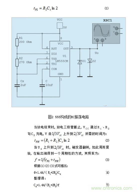 由555芯片構(gòu)成的多諧振蕩電路如圖2,CX為被測電容,接通電源后,CX被充電,A點電壓UA上升。當UA上升到時,觸發(fā)器被復位,同時555芯片內(nèi)部放電三極管導通,此時U0為低電平。CX通過R2和放電三極管放電,使UA下降。當UA下降到時,觸發(fā)器又被置位,U0翻轉(zhuǎn)為高電平。CX放電所需的時間為: