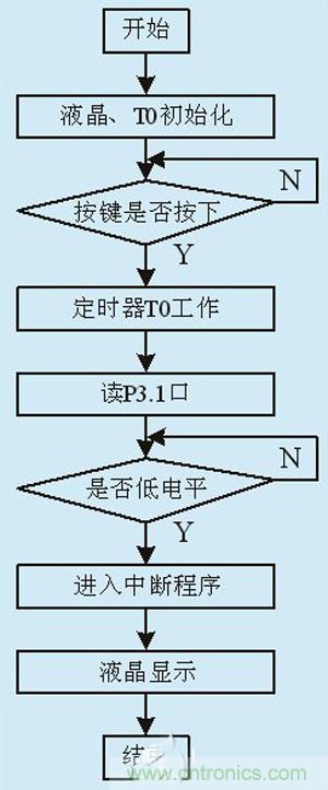 系統(tǒng)軟件環(huán)境以Keil4.0為仿真平臺,使用C語言編程編寫了運行程序;包括主程序模塊、顯示模塊和電容測試模塊。軟件設(shè)計主要包括三個方面:一是初始化系統(tǒng);二是按鍵檢測;三是數(shù)據(jù)采集、數(shù)據(jù)處理并進行顯示。程序采用模塊化的結(jié)構(gòu),這樣便于調(diào)試和修改,易編程和易讀性好,也程序結(jié)構(gòu)清楚。系統(tǒng)程序流程如圖6所示,首先對P3.5口脈沖信號頻率的測量,再通過(5)式算出所測的電容值,由LCD1602顯示出來。
