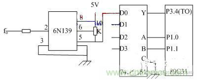 由圖2看出,傳感器頻率信號(hào)是通過(guò)光電耦合器6N139耦合到74HC151的輸入引腳D0。80C51的P1.0, P1.1輸出控制碼,選擇D0--D3輸入中的一路,用單片機(jī)的T0測(cè)信號(hào)頻率。
