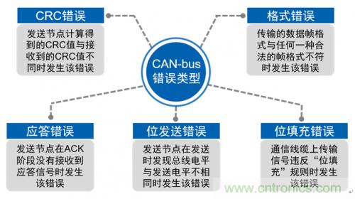 CAN-bus的可靠性很高,但是在某些情況下還是發(fā)生錯誤,為了使數(shù)據(jù)能夠在總線上可靠傳輸,CAN-bus規(guī)范對各類幀的格式、用途及發(fā)送時機都進行了詳細的規(guī)定。下面我們來總結下在CAN通訊中會出現(xiàn)哪些錯誤。