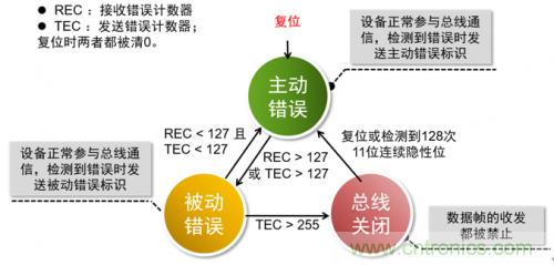 為了避免某個設備因為自身原因(例如硬件損壞)導致無法正常收發(fā)數(shù)據(jù)而不斷地破壞數(shù)據(jù)幀,從而影響其他正常節(jié)點通訊,CAN-bus規(guī)范中規(guī)定每個CAN控制器都有一個發(fā)送錯誤計數(shù)器和一個接收計數(shù)器。根據(jù)計數(shù)值不同CAN節(jié)點會處于不同的設備狀態(tài),狀態(tài)之間的轉換關系見下圖: