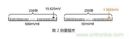 一般數字示波器采用的都是8位ADC,對任何一個波形值都是用256個0和1來重組。假設示波器垂直方向滿量程為8格,對應量化級數256。在垂直檔位為500mV/div的情況下,垂直精度為(500mV*8)/256=15.625 mV。測量同一個信號,在垂直檔位為50mV/div的情況下,即(50mV*8)/256=1.5625 mV,垂直精度就達到了1.5625 mV。