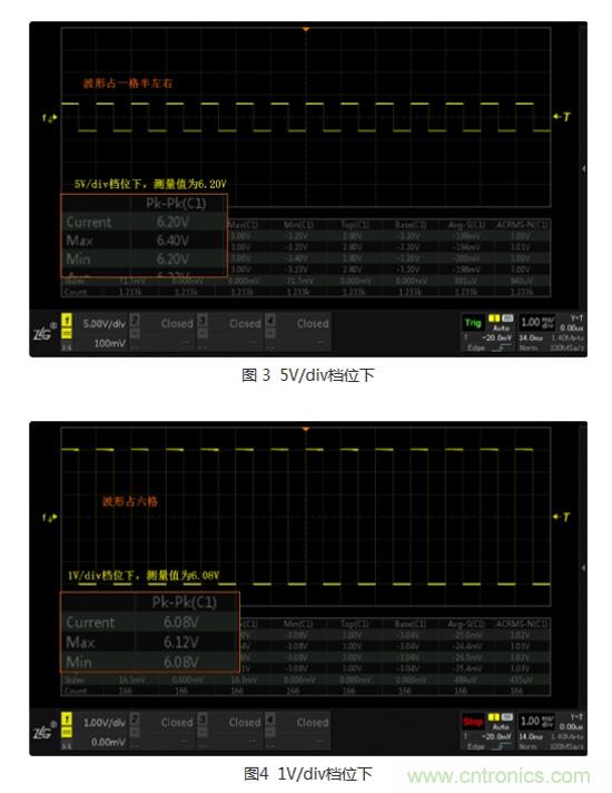 當波形占屏幕6格時,所測的峰峰值為6.08V,相差2個分辨率,相對6V的峰峰值誤差為1.3%。