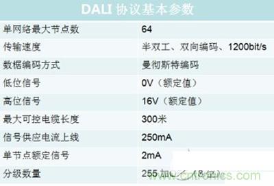 DALI數(shù)字式可尋址燈光接口(Digital Addressable LighTIng Interface)鎮(zhèn)流器是當(dāng)前最新的可調(diào)光熒光燈鎮(zhèn)流器。DALI是一個(gè)數(shù)據(jù)傳輸?shù)膮f(xié)議,它定義了電子鎮(zhèn)流器與設(shè)備控制器之間的通信方式,基于DALI 協(xié)議組建的系統(tǒng)具有分布式智能模塊, 各個(gè)智能化DALI 模塊都具有數(shù)字控制和數(shù)字通信能力, 地址和燈光場(chǎng)景信息等都存儲(chǔ)于各個(gè)DALI 模塊的存儲(chǔ)器內(nèi)。DALI 模塊通過(guò)DALI 總線進(jìn)行數(shù)字通信、傳遞指令和狀態(tài)信息,實(shí)現(xiàn)燈的開關(guān)、調(diào)光控制、系統(tǒng)的設(shè)置等功能。DALI總線制定一個(gè)系統(tǒng)結(jié)構(gòu)簡(jiǎn)單、安裝方便、操作容易、功能良優(yōu)的燈光控制系統(tǒng),可用于一個(gè)房間內(nèi)的燈光控制,還可以連接更高級(jí)的設(shè)備網(wǎng)絡(luò),如以太網(wǎng),以支持更多的設(shè)備和足夠的網(wǎng)絡(luò)帶寬。 DALI協(xié)議的基本參數(shù)如下: