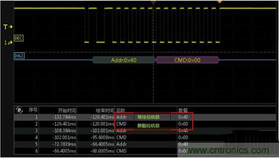 示波器ZDS4054 Plus為例,其免費(fèi)標(biāo)配DALI協(xié)議解碼功能,可對(duì)全內(nèi)存512Mpts的數(shù)據(jù)進(jìn)行解碼,且可對(duì)照明控制器與鎮(zhèn)流器之間的信號(hào)監(jiān)測(cè),取其中一幀數(shù)據(jù)的信息在事件表中進(jìn)行查看,如下圖6所示: