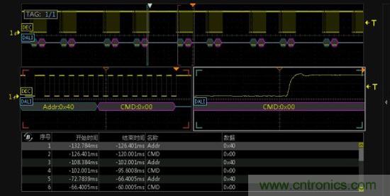 對(duì)長(zhǎng)時(shí)間監(jiān)測(cè)的數(shù)據(jù)進(jìn)行異常分析,可在示波器的縮放模式下使用雙ZOOM多窗口顯示的功能,對(duì)信號(hào)進(jìn)行多窗口異常監(jiān)測(cè)和分析,可同時(shí)對(duì)任一數(shù)據(jù)幀和數(shù)椐幀上升沿或下降沿細(xì)節(jié)進(jìn)行分析,然后通過(guò)查看放大數(shù)椐細(xì)節(jié),事件表中的數(shù)據(jù)和波形一一對(duì)應(yīng),定位異常非常方便,如下圖7所示。