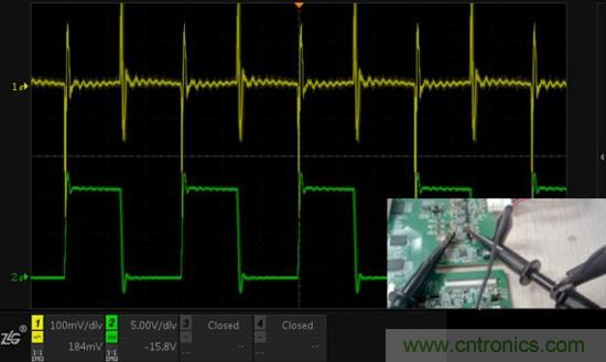 圖3.CH1使用夾子測量電源輸出,CH2使用夾子測量電感,單點接地