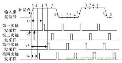 等效采樣有可以分為順序等效采樣和隨機等效采樣。順序等效采樣是在間隔K個周期捕獲一個樣值,每經過k個周期再經過一個微小的延時△t就獲得一個樣值。假設k=1時,每周期采樣N個點的等效采樣和重構過程。最后將采集的數據拼湊到一個周期內,實現對原始輸入信號波形的重構。重構后的采樣頻率變為微小延時△t的倒數。通過控制這個△t的大小,就可以控制等效采樣的頻率。實際采樣頻率可以通過控制K的大小進行調節。K越大,實際采樣頻率越小;而△t越小,等效采樣頻率越高。這樣就實現了低速采樣高頻信號的目的。