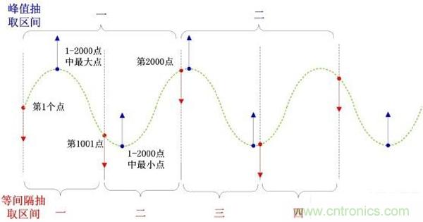 峰值抽取是采樣點有 2M,顯示點數 2k,實際顯示是 2k 個點抽取兩個,0~2000 點之間找最大和最小值,然后是 2001~4000 之間找最大和最小值,以此類推,重新構建波形。如下圖: