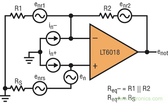 首先,把電阻器看作是噪聲源。電阻器天生具有與電阻值的平方根成比例的噪聲。在 300K 的溫度下,任何電阻器的電壓噪聲密度為 en = 0.13√R nV/√Hz。該噪聲也可被視為一種諾頓 (Norton) 等效電流噪聲:in = en/R = 0.13/√R nA/√Hz。因此,電阻器具有一個(gè) 17 zeptoWatts 的噪聲功率。優(yōu)良的運(yùn)放將具有低于該值的噪聲功率。例如:LT6018 的噪聲功率 (在 1kHz 頻率下測(cè)量) 約為 1 zeptoWatt。