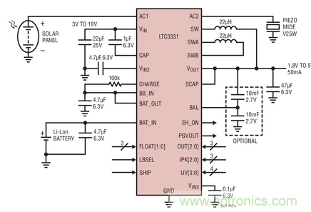 LTC3331 是一款完整的能量收集解決方案,提供高達(dá) 50mA 連續(xù)輸出電流,當(dāng)可收集能量可用時(shí)能延長(zhǎng)電池壽命。簡(jiǎn)便的 10mA 分流器用收集的能量給可充電電池充電,同時(shí)低電池電量斷接功能保護(hù)電池免于深度放電。當(dāng)用收集的能量向負(fù)載提供穩(wěn)定功率時(shí),該器件僅需要電池提供 200nA 電源電流,當(dāng)在無負(fù)載情況下由電池供電時(shí),僅需要 950nA 工作電流。LTC3331 集成了一個(gè)高壓能量收集電源、一個(gè)電池充電器和一個(gè)同步降壓-升壓型 DC/DC 轉(zhuǎn)換器,可為能量收集應(yīng)用提供一個(gè)持續(xù)穩(wěn)定的輸出,例如無線傳感器網(wǎng)絡(luò)中的能量收集應(yīng)用。能量收集電源由適合 AC 或 DC 輸入的全波橋式整流器和高效率降壓型轉(zhuǎn)換器組成,從壓電 (AC)、太陽(yáng)能 (DC)、或磁性 (AC) 能源收集能量。當(dāng)沒有收集能量可用時(shí),可充電電池輸入給降壓-升壓型轉(zhuǎn)換器供電,該轉(zhuǎn)換器在直至 4.2V 的整個(gè)電池電壓范圍內(nèi)運(yùn)行,無論輸入高于、低于或等于輸出,都可調(diào)節(jié)輸出。當(dāng)收集能源不再可用時(shí),LTC3331 自動(dòng)轉(zhuǎn)換至電池。LTC3331 的能量收集輸入在 3V 至 19V AC 或 DC 電壓范圍內(nèi)運(yùn)行,從而使該器件非常適合多種壓電、太陽(yáng)能或磁性能源。其輸入欠壓閉鎖門限設(shè)定是可編程的,范圍為 3V 至 18V,從而使應(yīng)用能夠在峰值功率傳送點(diǎn)上運(yùn)行能量收集電源。其他特點(diǎn)包括引腳可編程輸出電壓和降壓-升壓峰值電流限制、一個(gè)超級(jí)電容器平衡器和一個(gè)輸入保護(hù)性分路器。LTC3331 采用耐熱增強(qiáng)型 5mm x 5mm QFN 封裝。圖 3 顯示了 LTC3331 的典型應(yīng)用電路。