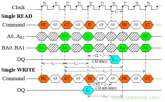圖中,頻率時間(tCK)是從此次頻率邊緣至下次頻率邊緣為止的時間。列地址選通預充電時間(tRP)是從PRE命令至ACT命令為止的時間。列地址選通至行地址選通延遲(tRCD)是從ACT命令至RD命令或WR命令為止的時間。行地址選通潛伏(CL)是從RD命令開始等候一段時間,并且以tCK為基本單位,然后乘上倍數。寫入時間(tWR)是從WR命令至PRE命令為止的時間;另外還可以tCK為基本單位,然后乘上倍數,如同行地址選通潛伏的計時方法,因此命名為行地址選通寫入潛伏(CWL)。列地址選通時間(tRAS)是從ACT命令至PRE命令為止的時間。更新命令時期(tRC)是從這次ACT命令至下次ACT命令為止的時間。