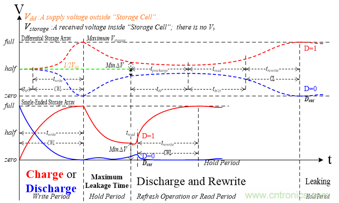 如果說3T DRAM是第一代DRAM技術,使用差動放大器實現讀取功能的1T DRAM是第二代DRAM,那么在本文中的第三代DRAM技術是指取代差動放大器且大幅提升讀取功能的存取技術。1T DRAM的內存基本單位是由一晶體管和一電容器所組成的儲存單元,又稱為1T DRAM單元。圖3顯示在單一儲存單元上進行存取操作的波形,上半部分是使用差動放大器的第二代技術,下半部分是第三代技術,此圖主要用于比較這二者完成讀取操作所需花費的最長時間。當這一電容器的儲存電壓(Vstorage)放電達到最小差異電壓(Min. ?V)時就必須立即進行更新操作(即讀取),所以此圖呈現有關讀取操作的最長時間就等于是更新操作的最長時間。圖中標示有tprecharge、tread、trewrite、twrite,這些技術用語依序對應產品規格的tRP、tRCD、CL與CWL。第三代技術無需tRP,除此之外,tRCD也很短暫且可由CWL替換CL,因此訪問速度接近SRAM,存取效率低于SRAM。
