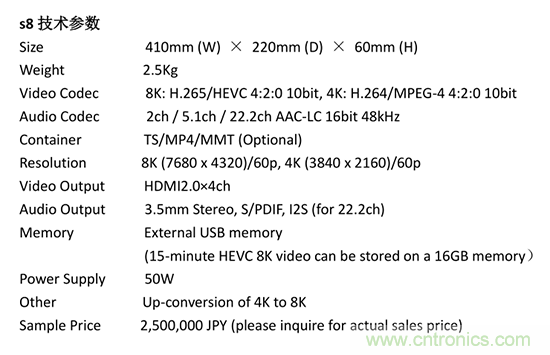 索喜科技宣布,獨自研發(fā)搭載有8K HEVC解碼芯片的世界最小、最輕型8K/4K媒體播放器“S8”。該產(chǎn)品預(yù)計于2018年3月起向LED直播大屏幕及數(shù)字標牌等廣告媒體商提供銷售。索喜科技將以這款播放器為中心,構(gòu)筑8K影像編碼、發(fā)送、解碼、顯示一系列解決方案,為超精細影像場景的普及提供多種解決方案。