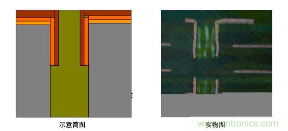 4. 塞孔無銅:圖電蝕刻后,有明顯的物質卡塞在孔中,大部分孔壁被蝕掉,斷口處圖電層未將板電層包住。