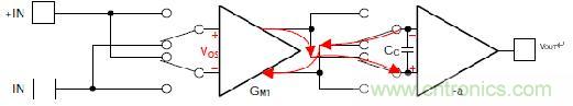 圖4顯示了后半個(gè)周期。在這里,兩組開關(guān)都配置為通過未改變的方式傳遞信號(hào)和失調(diào)誤差。實(shí)際上,輸入信號(hào)永遠(yuǎn)不會(huì)發(fā)生相位變化,始終保持不變。由于來自第一時(shí)鐘相位和第二時(shí)鐘相位的失調(diào)誤差極性相反,因此誤差被平均為零。