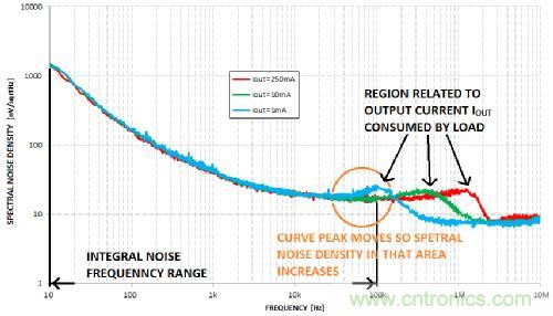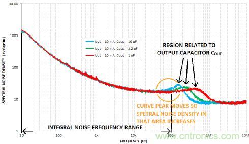 但是,如何表示LDO輸出的噪聲有多大呢?可用如上文所示的積分噪聲頻率范圍表示。這個(gè)范圍通常是10赫茲至100千赫。