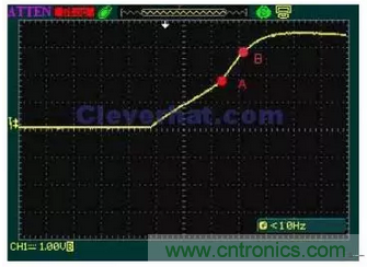 從圖中可以看到,在A點以下,當采樣電壓小于1.8V(電流小于3.6A),電流隨時間平穩上升。過A點后電流上升速度明顯加快,因此該電感的飽和電流與為3.6A。