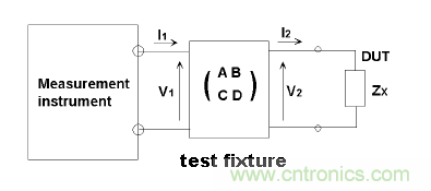 射頻電感電感量測(cè)量的原理圖如上,對(duì)于測(cè)試夾具的殘留因素和離散因素對(duì)測(cè)量系統(tǒng)的影響,行業(yè)的通用做法是用下面所示的F參數(shù)來(lái)描述:
