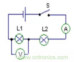 如圖所示,我們可以把電路圖分為兩部分:“和電壓表并聯(lián)部分”即L1和“并聯(lián)以外部分”——L2、電流表、開關(guān)。