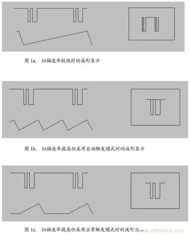 圖1 是這種情況的圖解,在圖1 中,左側(cè)上方是被觀測(cè)的波形,下方是掃描波形,右側(cè)是波形的顯示。圖1a中掃描速率較低,不便于觀察波形的細(xì)節(jié);圖1b將掃描速率提高,采用自動(dòng)觸發(fā)模式,這時(shí)顯示的波形是不清晰的,有混疊現(xiàn)象;圖1c中的掃描速率與圖1b相同,但采用正常觸發(fā)方式,僅在有觸發(fā)時(shí)才進(jìn)行掃描,因而顯示清晰的波形。