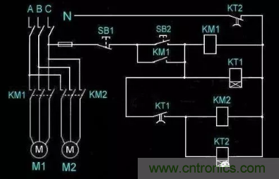 各個引腳的含義我們已經(jīng)搞清楚了,下面就可以根據(jù)控制原因進行接線,我們以下圖為例,在電路中加入KT通電延時時間繼電器,當按下啟動按鈕SB2線圈KT1、KM1得電交流接觸器KM1吸合,電動機M1轉(zhuǎn)動,延時閉合開關(guān)KT1到達時間吸合,KM2、KT2得電,交流接觸器KM2得電吸合,電動機M2轉(zhuǎn)動,延時斷開開關(guān)KT2在到達時間以后斷開,整個控制回路斷開,所有電機停止轉(zhuǎn)動;