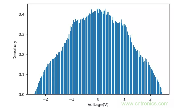 使用示波器采集上面隨機噪聲信號280k個數(shù)值,發(fā)送到計算機。統(tǒng)計它們的直方圖分布如下圖所示。