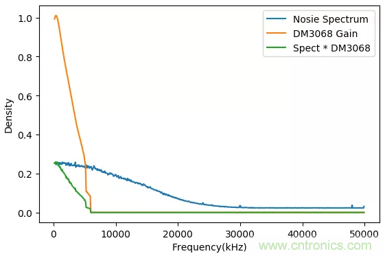隨機信號頻譜(藍色),DM 3068頻譜特性(黃色),實際測量隨機噪聲各頻率分量的數(shù)值(綠色)
