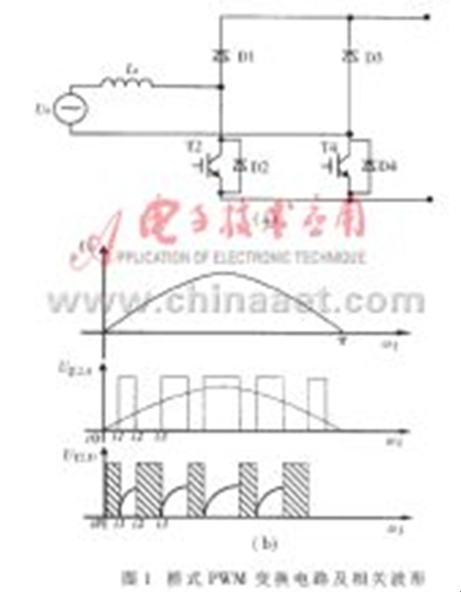 圖1(a)所示為工作在PWM整流狀態的H型橋式PWM變換電路(此圖為正弦波正半波輸入下的等效電路,上半橋的兩只IGBT未畫出),圖1(b)為下半橋兩只大功率器件的驅動信號和相關的器件波形。現以正半波工作過程為例進行分析(對于三相PWM電路,在整流、逆變工作狀態或單相DC/DC工作狀態下,PWM電路的分析過程及結論基本類似)。