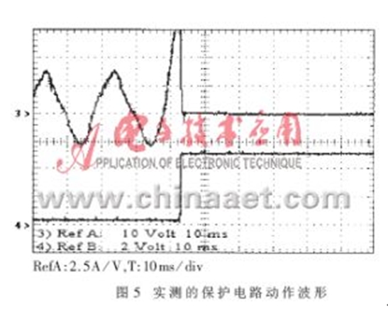 圖5所示為IGBT過流時實際檢測到的PFC電感中流過的電流及保護電路動作的波形。