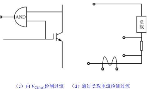 此方法與圖5(a)中的檢測方法基本相同,但圖5(a)屬直接法,此屬間接法,如圖5(d)所示。若負載短路或負載電流加大時,也可能使前級的IGBT的集電極電流增大,導致IGBT損壞。由負載處(或IGBT的后一級電路)檢測到異常后,控制執(zhí)行機構(gòu)切斷IGBT的輸入,達到保護的目的。