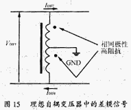 從差模信號看,有中心抽頭的自耦變壓器是兩個在相位上相同的對分繞組,見圖15。這就意味差模電流在其中所形成的磁場,會使其對差模電流呈現高阻抗。相當于對差模信號并聯了一個高阻值的阻抗,它對差模信號的大小沒有影響。