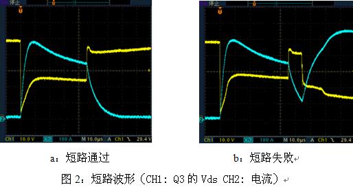 當控制器工作時,如電機短路,則會形成如圖1中所示的流經Q2,Q3的短路電流,其電流值很大,達幾百安培,MOSFET的瞬態(tài)溫升很大,這種情況下應及時保護,否則會使MOSFET結點溫度過高而使MOSFET損壞。短路時Q3電壓和電流波形如圖2所示。圖2a中的MOSFET能承受45us的大電流短路,而圖2b中的MOSFET不能承受45us的大電流短路,當脈沖45us關斷后,Vds回升,由于溫度過高,僅經過10us的時間MOSFET便短路,Vds迅速下降,短路電流迅速上升。由圖2我們可以看出短路時峰值電流達500A,這是由于短路時MOSFET直接將電源正負極短路,回路阻抗是導線,PCB走線及MOSFET的Rds(on)之和,其數(shù)值很小,一般為幾十毫歐至幾百毫歐。