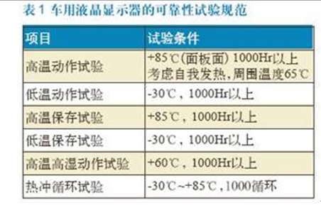 車用液晶顯示器最基本的要求特性就是耐環(huán)境性,表1是車用液晶顯示器的可靠性試驗(yàn)規(guī)范。隨著汽車廠商的不同,要求條件更嚴(yán)苛的耐環(huán)境試驗(yàn),例如高溫+ 95℃、低溫-40℃,高溫高濕65℃、濕度90%,試驗(yàn)時間2000小時等特性,面臨這種情況,業(yè)者利用隨機(jī)抽樣樣品進(jìn)行試驗(yàn),確認(rèn)使用上完全符合耐環(huán)境試驗(yàn)要求的特性。