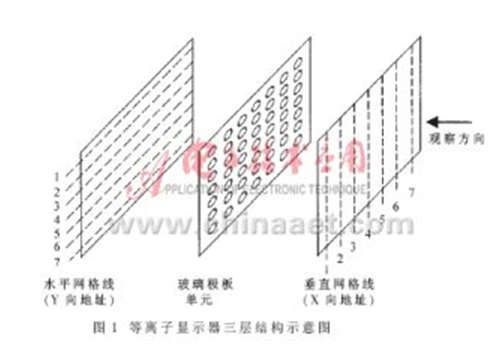 等離子顯示器是一種利用氣體放電的顯示裝置,這種屏幕采用了等離子管作為發(fā)光元件。大量的等離子管排列在一起構(gòu)成屏幕。每個(gè)等離子對(duì)應(yīng)的每個(gè)小室內(nèi)都充有氖氙氣體。在等離子管電極間加上高壓后,封在兩層玻璃之間的等離子管小室中的氣體會(huì)產(chǎn)生紫外光,從而激勵(lì)平板顯示器上的紅綠藍(lán)三基色熒光粉發(fā)出可見光。每個(gè)離子管作為一個(gè)像素,由這些像素的明暗和顏色變化組合,產(chǎn)生各種灰度和色彩的圖像,與顯像管發(fā)光相似。等離子體技術(shù)同其它顯示方式相比存在明顯的差別,在結(jié)構(gòu)和組成方面領(lǐng)先一步。其工作機(jī)理類似普通日光燈,等離子顯示器的三層結(jié)構(gòu)如圖1所示。一般由三層玻璃板組成。在第一層的里面涂有導(dǎo)電材料的垂直條,中間層是燈泡陣列,第三層表面涂有導(dǎo)電材料的水平條。要點(diǎn)亮某個(gè)地址的燈泡,開始要在相應(yīng)行上加較高的電壓,等該燈泡點(diǎn)亮后,可用低電壓維持氖氣燈泡的亮度。關(guān)掉某個(gè)燈泡,只要將相應(yīng)的電壓降低。燈泡開關(guān)的周期時(shí)間是15ms,通過改變控制電壓,可以使等離子板顯示不同灰度的圖形。彩色等離子板目前還處于快速發(fā)展階段。