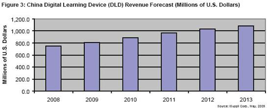 據(jù)iSuppli公司,隨著面向新用戶群的新型產(chǎn)品問世,2013年中國(guó)數(shù)碼學(xué)習(xí)設(shè)備(DLD)出貨額將上升到10億美元以上。DLD是提供數(shù)碼學(xué)習(xí)內(nèi)容的電子產(chǎn)品。