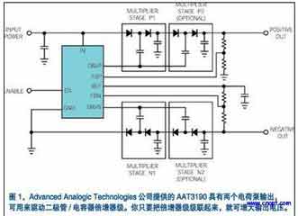 AdvancedAnalogicTechnologies公司的副總裁JanNilsson評述道:“許多手機、數碼相機及其它便攜式設備中的有源矩陣LCD和OLED……子系統要求正負兩種小電流偏置電源。”這種情況使得電源前景復雜化。AdvancedAnalogicTechnologies公司推出的AAT3190能滿足這種需求,因為它借助一塊采用自同步雙電荷泵體系結構其工作于標稱1MHz的開關頻率芯片來生成正負兩種電源(圖1)。這種電荷泵可利用2.7V~5.5V的單極性輸入電源產生最大可達±25V的可調輸出電壓。
